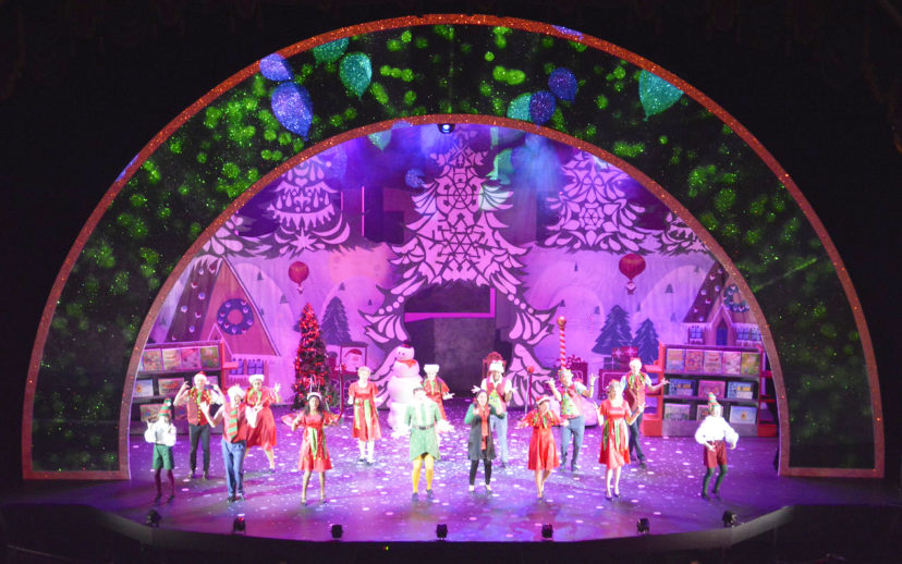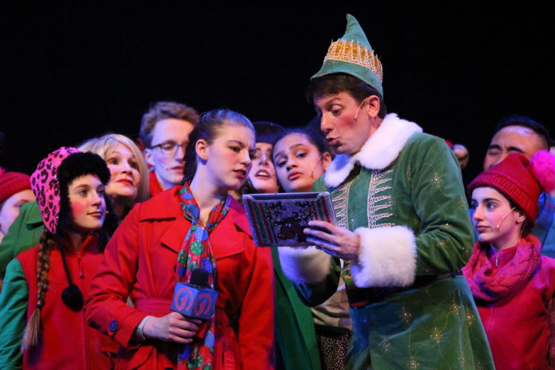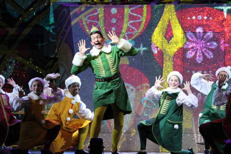 The story begins when Buddy (Dan Chevalier) gets the news from his best pal Santa Claus (Zach Kloppenborg) that he is, in fact, human. Buddy embarks on a Christmas quest to find his real dad, workaholic Walter Hobbs (Anthony Clark-Kaczmarek) and a new life in New York! His hijinks lead him to Macy’s where he finds the most beautiful elf he has ever seen, Jovie (Regina Palmer), and he has to instill Christmas joy into Jovie and all the other elves he encounters, as well as his own family! The cast, comprised of 28, brings energy and life to the stage, while dishing out one-liners and holiday hilarity at the same time. Plus, they all came to pet me after the show! I guess wearing my elf outfit paid off after all.